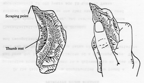 Shape. Figure 1, the top view of the scraper, best reveals its shape. The tool has an irregular, slightly less than half-moon shape, with one end tapering to more of a point than the other. The curved sides taper from a relatively flat base to the top.