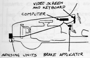 Intersection Statements. When an intersection approaches, the computer will need to know if the map should follow another road. Therefore, when the intersection is aobut 250 yards in front of the car, the top of the video screen reads: HIGHWAY 260 AHEAD The statement stays on the screen for 10 seconds and if the driver does not want to turn he pushes no keys. But if he wants to go west on 260, he pushes the "w" direction key. The computer then follows Highway 260 West instead of the previous road. Brake Applicator The brake applicator is the only automated control device of the car's safety system. It is wired to the computer which tells it if the infrared detector has detected something not moving and directly in front of the car. This could be, for example, a recent car wreck or a deer in the car's lane. If an object is detected in this area, the brake applicator slowly starts applying the brake in case the driver's reflexes are not quick enough. The applicator will not stop the car completely, but will apply the brake for five seconds. If the object is not directly in front of the car, the brake is not applied automatically. This device is used simply because it is very likely that the car will collide with the object if not slowed immediately. 10