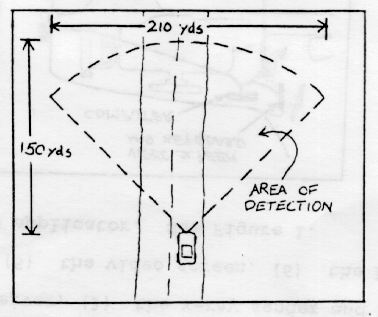 upcoming trouble (before the driver) by sensing its warm-bloodedness and then alerts the driver. The detector will sense the warmth of any warm-blooded animal larger than a rabbit, which includes deer and cattle--the two main causes of wildlife-related accidents. Equally important is the fact that other cars on the road give off detectable heat. By detecting these other cars, the driver is informed of upcoming traffic, a recent accident blocking the road ahead, or a stalled car, if some heat is still present in that car [6]. The driver is informed graphically by the video screen in his car, and to differentiate the wildlife from another car, the x-ray unit is used to check for metal in the detected object. So, if a warm object is detected with metal in it, the computer reads it as a car and shows it on the screen as a yellow dot. Contrastingly, if no metal is detected in the warm object, an animal is assumed and plotted as a red dot. Radar Sender and Receiver In order to find the exact location of the detected trouble, a radar sender and receiver is used. It is one of the three detecting devices mounted on the front of the car which constantly scans the road ahead for trouble. If the infrared detector detects heat from an upcoming object, the radar sender is activated immediately and radar waves are sent to the object. When the waves bounce off, they return to a parabolic mirror which contains the radar receiver. Here, the object's distance and position are calculated by the computer from the time of wave travel, and coordinates are found and plotted on the screen as a dot. This entire process takes less than 1/10th of a second once the heat is detected [1]. See Figure 2 for the detection range of the detecting devices. Figure 2. Detection Range X-Ray Sender and Receiver The x-ray sender, used to detect metal in the upcoming object, is activated simultaneously with the radar sender. Working similarly to the radar, the x-rays are sent out and bounced back if metal is present. If no metal is present the wave is not returned to the receiver and the computer reads the information as an animal since nearly anything which is warm and does not contain metal is usually an animal. So, the instant at which heat is detected, the radar 4