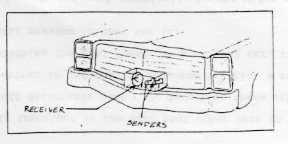 and x-ray senders are activated to acquire position and metal content knowledge of the object. The three units mounted on the front of the car are the parabolic mirror (which contains the infrared, radar, and x-ray receivers), the radar sender, and the x-ray sender. These units are shown in mounted position in Figure 3. The units rotate in unison through a 90 degree angle every 1/2 second. This rotation gives a detection range of 150 yards in front of the car and 105 yards on each side. See Figure 2. They are also enclosed in a plexiglass box for protection from stones and insects. (The plexiglass is a very high grade so that refraction of the detecting waves is minimal.) Figure 3. Mounting of Detection Units On-Board Computer The computer is mounted under the dash and preprogrammed to read and analyze two things: (1) the map discs and (2) the receptions from the detectors. 5