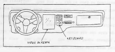 and metal are both detected inthe same object, the computer analyzes it as another car and produces a yellow dot on the screen. But if only heat is detected, an animal is assumed and a red dot appears. Video Screen. The video screen is the component mounted on the face of the dashboard. As shown in Figure 4, it is in easy view of the driver just to the right of the steering wheel. Its graphic projection is very similar looking to that of a video game screen. Its functions are to display the flowing map and to show the driver exactly where any trouble is ahead so he can make adjustments in speed. An example of the graphic projection is shown in Figure 5. Figure 4. Components Mounted on Dash 7