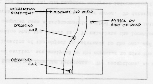 Map Discs. There are three map discs each of which contains a section of the United States' highways and roads. The computer reads the discs and projects a bird's-eye view of the road the driver is on onto the video screen. (The driver determines the road by plotting coordinates on the keyboard as will be discussed later in the report.) As the car travels down the road, the map flows along respectively to the car. The graphic projection is very similar to the popular road-race video games. The car appears at the bottom of the screen as a blue dot. Since the computer knows when an intersection in the road is approaching, it notifies the driver by a statement at the top of the screen. The driver then pushes a certain button to let the computer know if he wants to turn at the intersection, and if so, in which direction. The map then follows that direction on the new road or stays on the same one, whichever was indicated. Receptions from the detectors. The receptions, as mentioned earlier, are analyzed by the computer to give the exact location of the object in reference to the car, and to determine what the object is. To calculate the location, the computer uses a trigonometric method from which initial information is supplied by the radar waves. To determine what the object is, the computer analyzes information from the infrared and x-ray detectors. As has been said, if heat 6