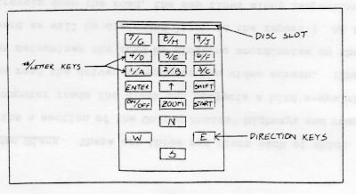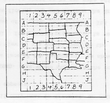 Positioning Car. When a disc is inserted into the slot above the keyboard, a map of the chosen section of the country appears with coordinates on the video screen. The numbers and letters which correspond to these coordinates are punched in the keyboard so that the screen will zoom in on a smaller area. See Figure 7. The driver keeps zooming to a smaller area until the exact area where his car sits appears. (This process is done by pushing the "number/letter" key then the "zoom" key.) Next, one of the four direction keys are pushed to tell the computer which direction the car will be traveling. Then the " " key is used to position the blue dot even more exactly. The "start" key is the last key in the positioning process and is to be pushed immediately before the car starts in motion. Figure 7. Coordinate Projection on Video Screen 9