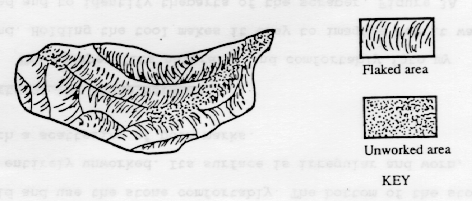 Texture. The rock used to make the implement is chert, commonly called "flint." When struck with another harder stone, layers of chert flake off, leaving smooth, flat surfaces with relatively sharp edges. Certain edges of the implement have been filed or ground to make it possible to hold and use the stone comfortably. The bottom of the stone is entirely unworked. Its surface is irregular and worn, with a scattering of pock marks.